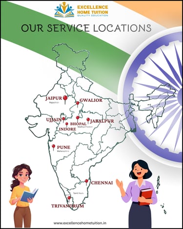 Excellence Home Tuition is proud to expand its trusted education services across multiple cities in India. We are now available in Jabalpur, Bhopal, Indore, Ujjain, Gwalior, Jaipur, Pune, Chennai, and Trivandrum. Our mission is to provide quality home and online tutoring with experienced teachers, personalized learning, and strong academic support. With years of dedication to student success, we continue to grow and bring reliable educational guidance to more families and students across these locations.