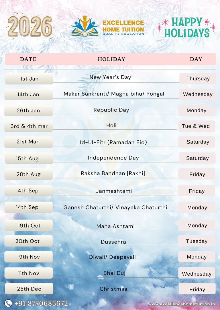 There will be no classes on national holidays such as Republic Day, Independence Day, and significant festivals like Holi, Diwali, Dusserha, etc. To know more, kindly check our official holiday list provided below.